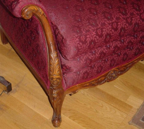 Maroon Damask Material, Detail Carved Wood, Four Front Legs and Is
